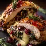 This stuffed chicken is filled with a creamy mixture of brie cheese, sweet cranberries, and fresh spinach, offering a delightful balance of flavors.