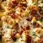 A comforting casserole made with chicken, creamy sauce, and cheesy goodness, topped with crispy bacon, perfect for family meals or sharing with friends.