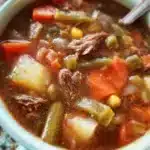 My Mom’s Old-Fashioned Vegetable Beef Soup is a slow-cooked beef and vegetable soup. You brown and shred a pot roast, then simmer it with potatoes, carrots, peas, green beans, corn, broth, and tomato soup. The soup is thick, hearty, and easy to make for a cold day.