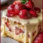 Strawberry Custard Delight Cake has soft cake layers, smooth custard, and bright strawberries. You make a simple vanilla cake, a thick custard filling, then layer them with fresh fruit. The cake tastes light and creamy. It cools in the fridge so it serves well on a warm day.