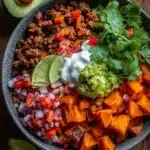 A delightful and nutritious taco bowl featuring roasted sweet potatoes, seasoned meat, and fresh toppings.